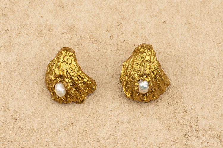 Handmade Gold Statement Stud Earrings, with a single fresh Pearl.