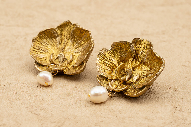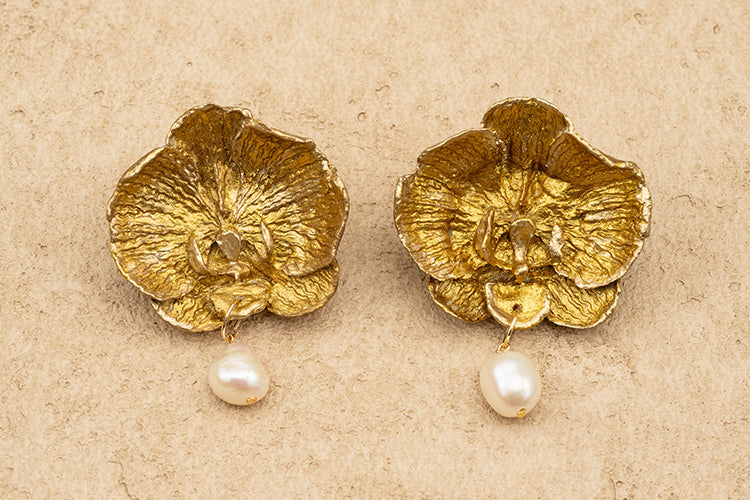Handmade Orchid Gold Statement Stud Earrings, with a single drop Pearl.