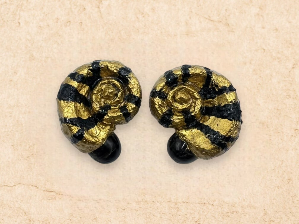 Handmade Black/Gold Snail Shape Stud Earrings, With Raw Egg Shape Black Opal